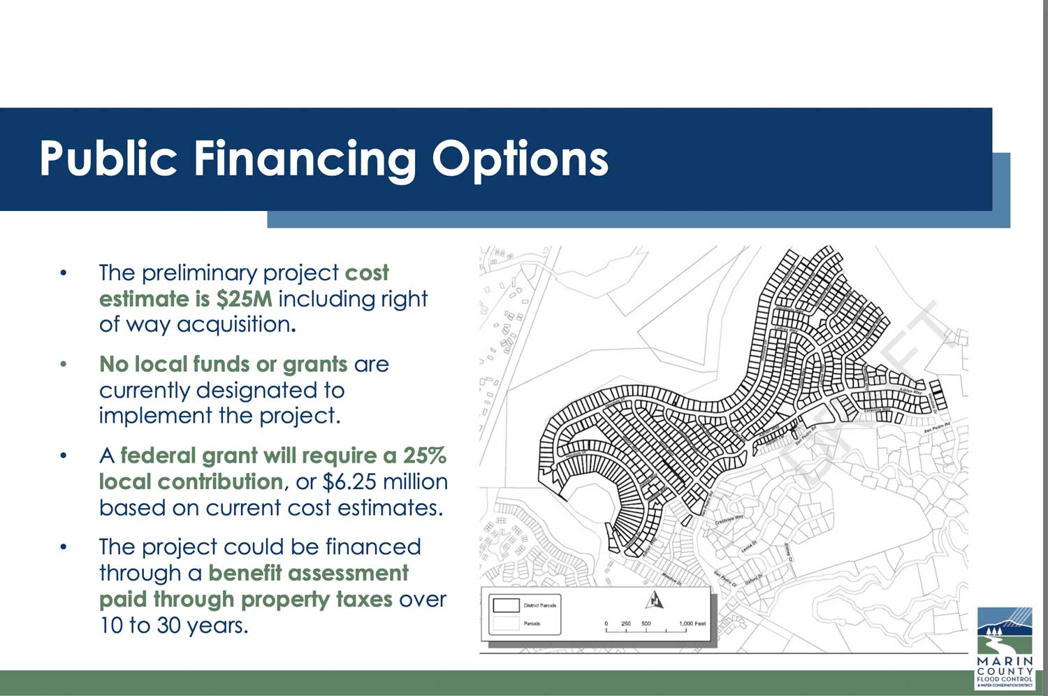 The County estimates the cost at $25,000,000 and expects you and the residents of Santa Venetia to pay as much as $2,500 per year for thirty years. If the County can get a state or federal grant the tax may only be $610 per year. It is important to note that there is no State or Federal Grant program currently available that the County can apply for.